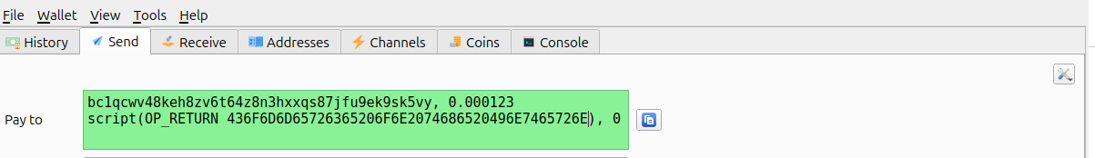 . You must convert your text to hex and paste after OP_RETURN . The first address can be your own wallet address - Don’t directly send from electrum at it will refuse to broadcast it