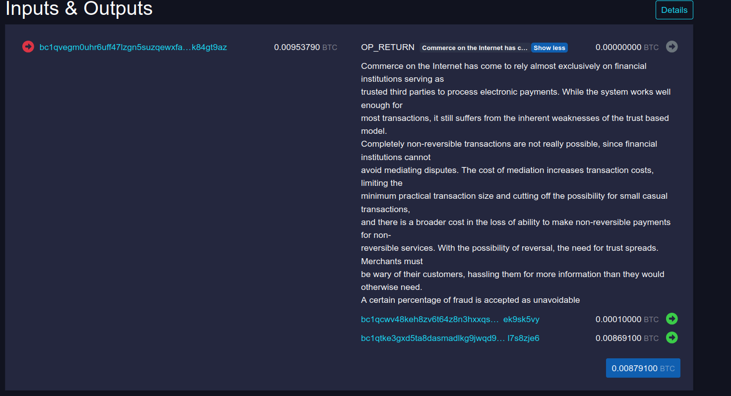 Two transactions with 912 bytes in OP_RETURN . Text is starting of satoshi.pdf